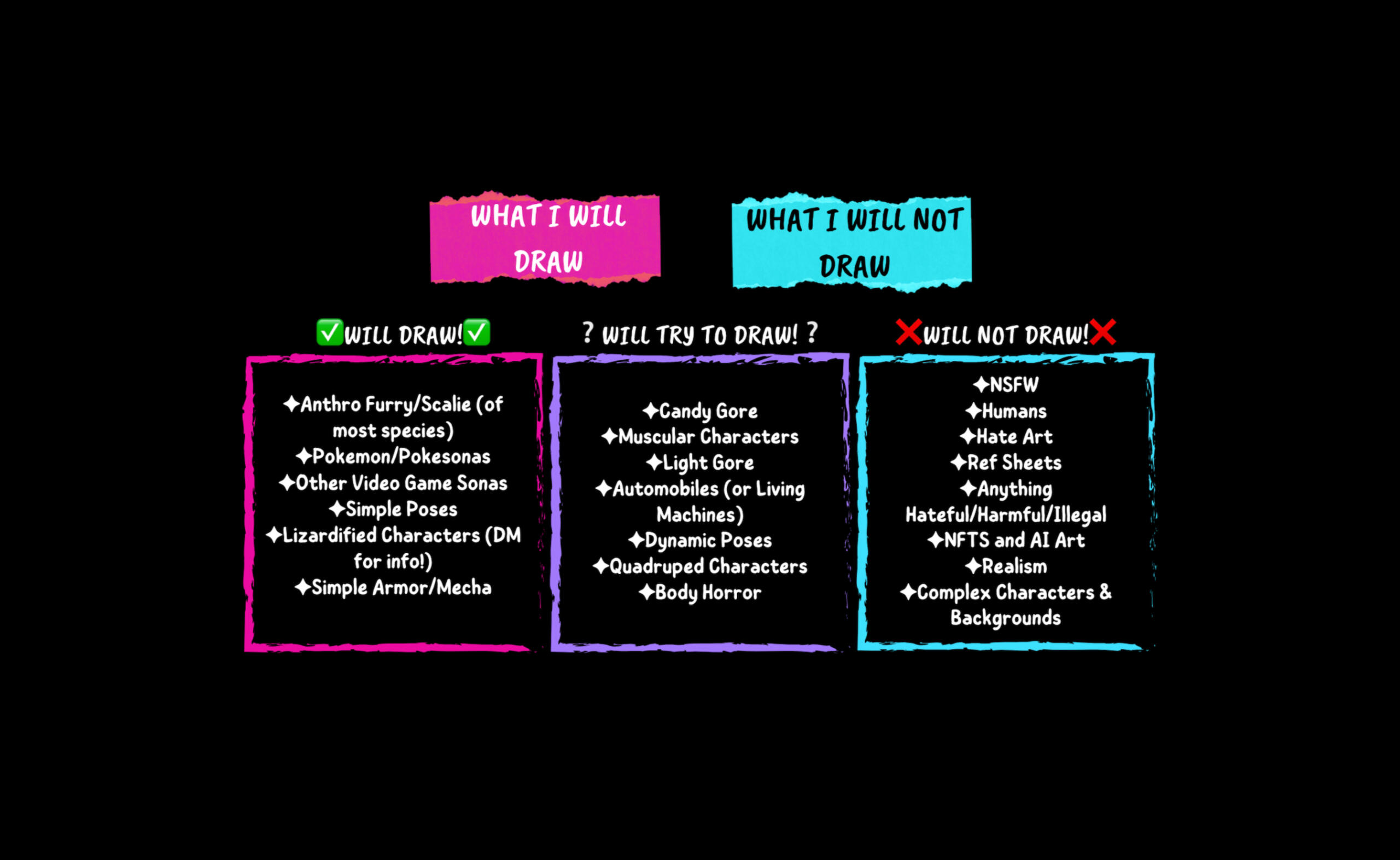If you have any additional questions please feel welcomed to DM me, communication is key and I will always do my best to keep on top of it so that your commission is well handled! Have a wonderful day! <3